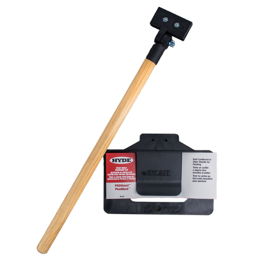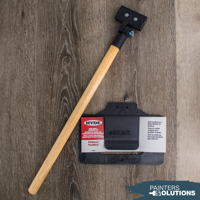 High-impact polystyrene clip holds cardboard or other sheets well supplied by customers. Cut custom shapes and sizes. The patented PivotNeck system adjusts the shield to any angle. 18" Acme thread hardwood handle included. Also, it can be used with an extension pole (one included) and does not include cardboard (sold separately).