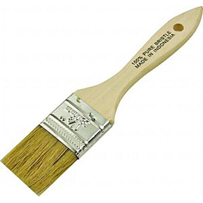 White china bristle, square trim, tin-plated steel ferrule and unfinished wood handle.