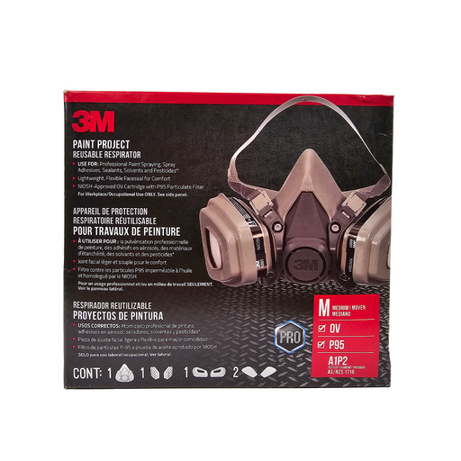 The medium 3M™ Performance Respirator Paint Project 6211 helps provide protection against particles and certain organic vapors with the convenience of an all-in-one kit. Designed for professionals, this reusable respirator is excellent for spray painting and projects that require solvents or pesticides. The swept-back design of the 3M™ Organic Vapor Cartridges allow a wide field of view and, when combined with the provided filters, can help provide effective particulate filtration on the job. When you're handling potentially harmful chemicals, it's important to help protect yourself—so make sure to pick up the 3M™ Performance Respirator Paint Project 6211.