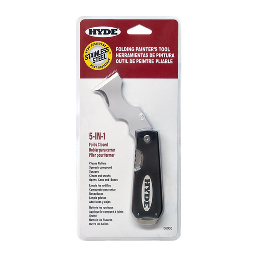 HydeThe rust resistant folding 5-in-1 stainless steel painter's tool gets more done without taking up more space. Clean rollers, spread compound, scrap...
